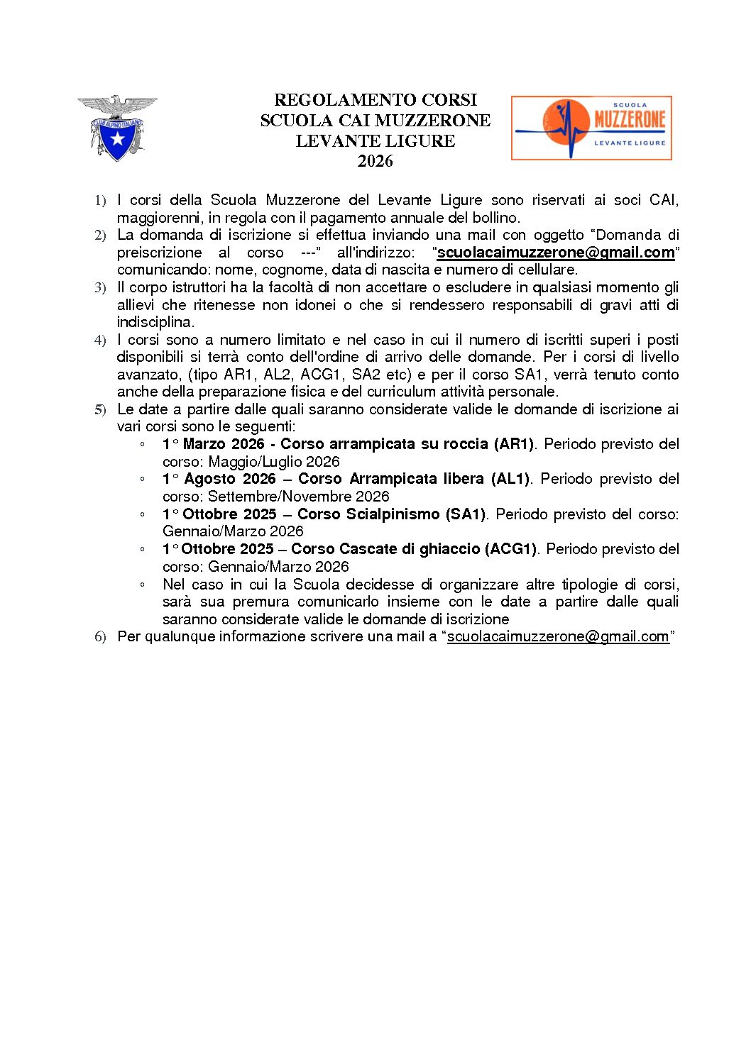 REGOLAMENTO ISCRIZIONE CORSI 2025/26 SCUOLA CAI MUZZERONE LEVANTE LIGURE